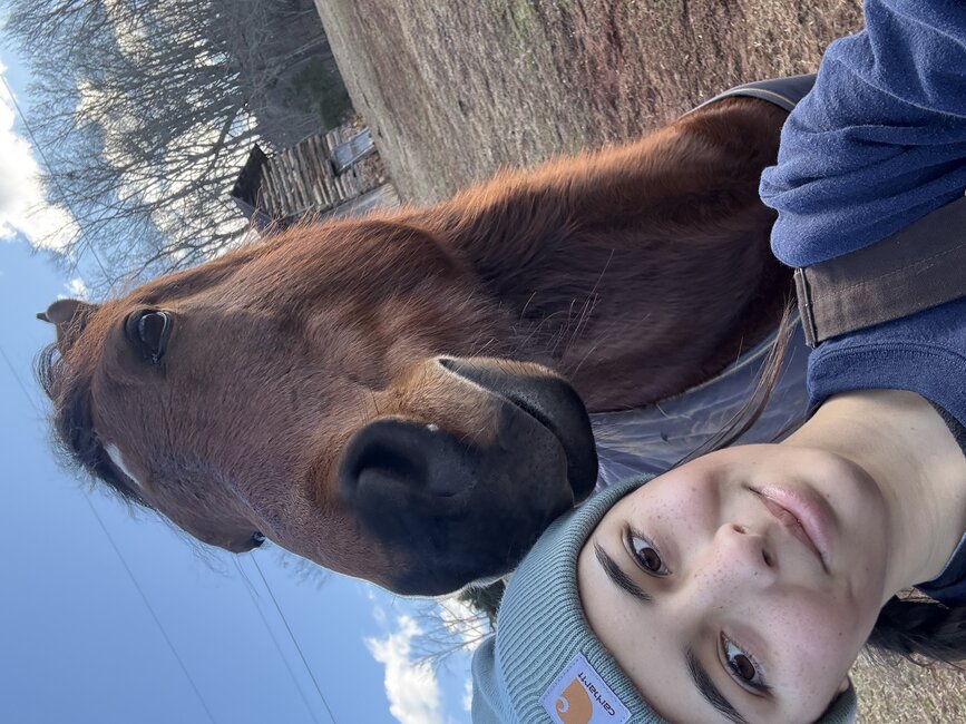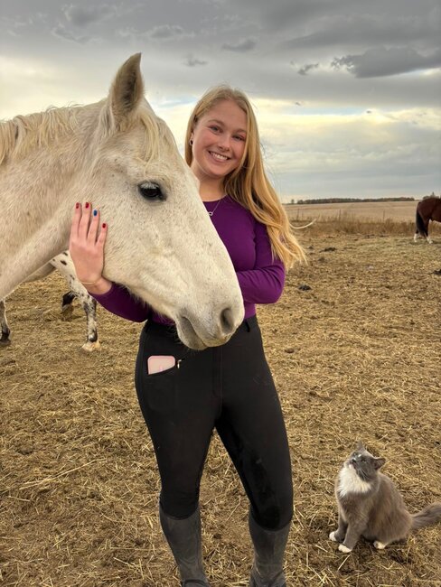 Baylee is our newest working student and has done an amazing job learning the day-to-day of horse care. Her favorite horse on the farm is Khalil, one of our prized school horses. Her favorite thing to do is hang out with all the horses and take silly selfies with them.